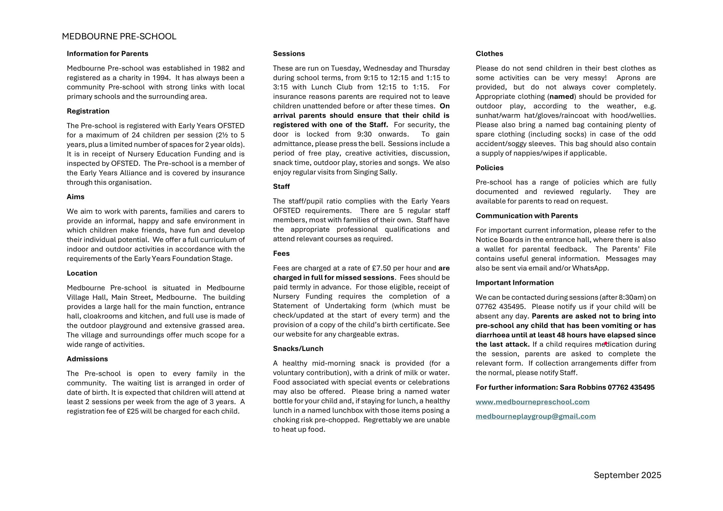 Medbourne Pre-school is open to every family in the community. We welcome children from Medbourne, Nevill Holt, Slawston, Hallaton, Ashley, Great Easton, Caldecott, Lyddington, Bringhurst, Drayton, Weston by Welland, Dingley, Brampton Ash, Sutton Bassett, Middleton, Cottingham and surrounding areas from their second birthday until they turn 5. The waiting list is arranged in order of date of birth. It is expected that children will attend at least 2 sessions per week from the age of 3 years.